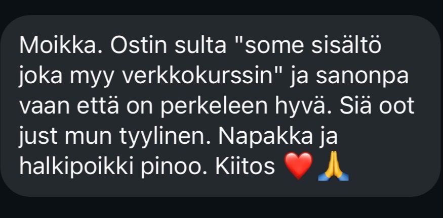 Nyt mulla on systeemi, jolla oon saanut somepostauksilla myytyä sekä 9 € digituotteita että yli 2000 € maksavaa valmennusta. Ja tämän systeemin mä haluan antaa sulle.