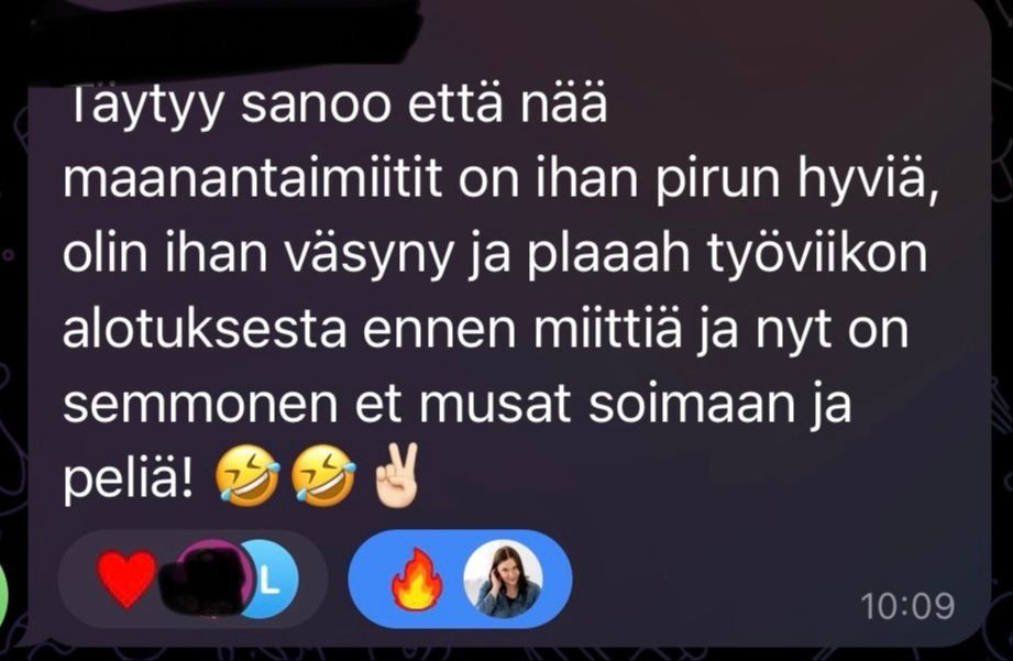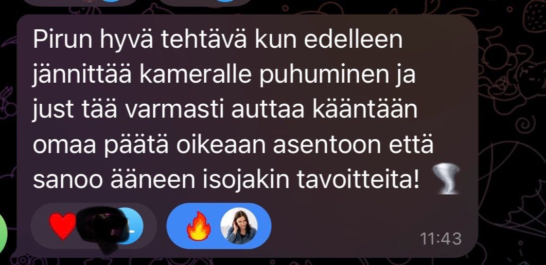 Telegram-kanavassa voit jakaa kysymyksiĂ€, oivalluksia ja saada vertaistukea silloin kun sitĂ€ tarvitset. Se toimii jatkuvana selkĂ€nojana valmennuksen aikana â ja pitÀÀ sinut kiinni tekemisessĂ€ myös ryhmĂ€livien ulkopuolella. Usein eteneminen tyssÀÀ yksin jÀÀmiseen tai epĂ€varmuuteen.