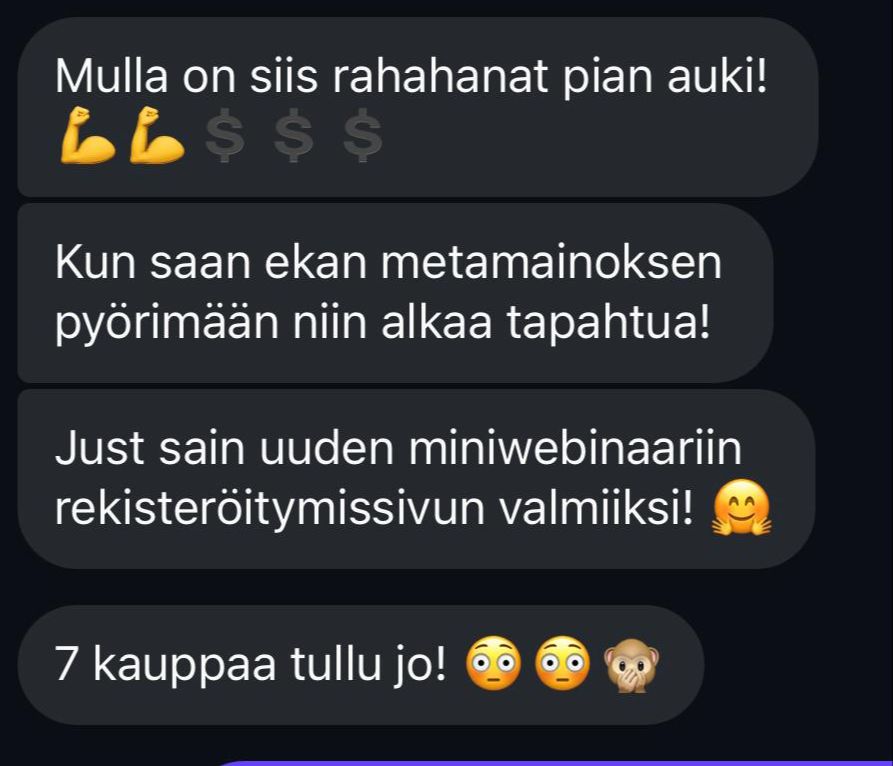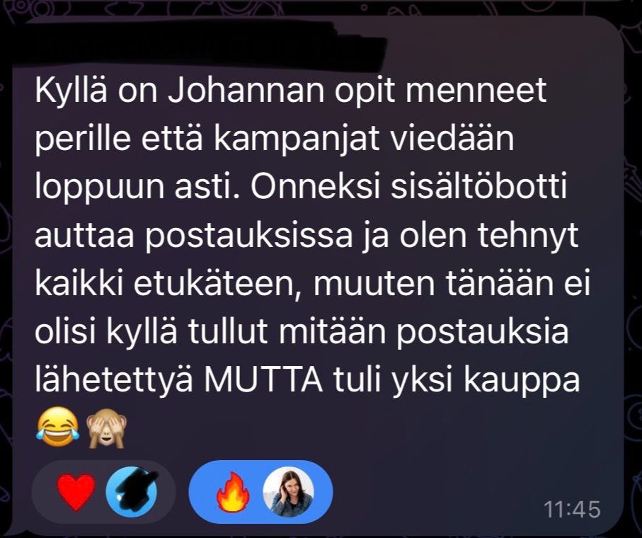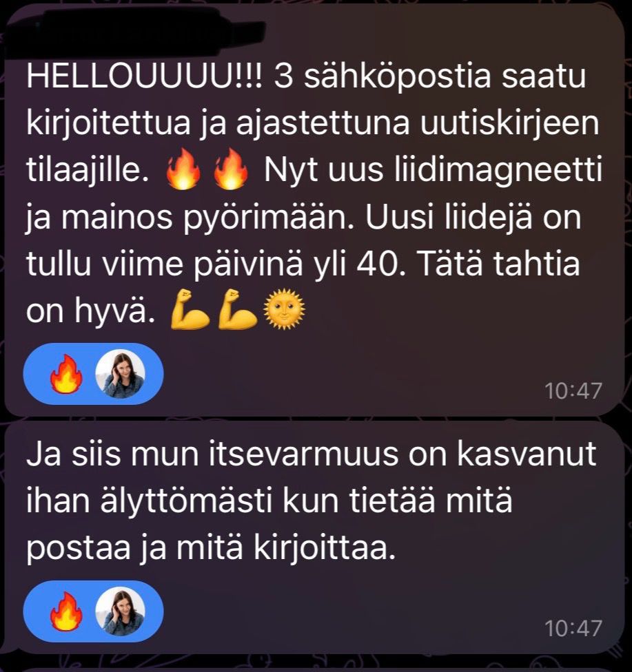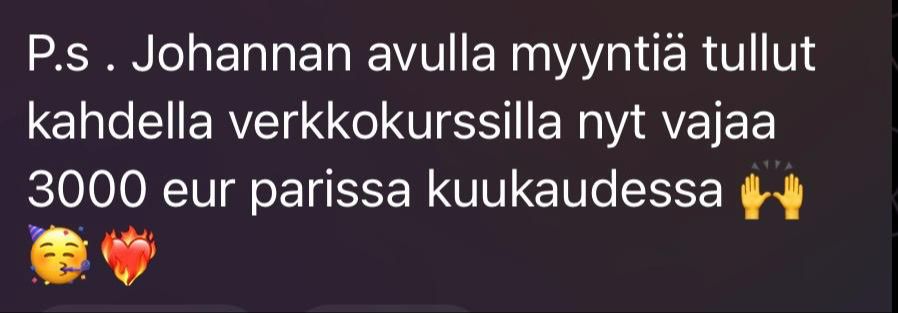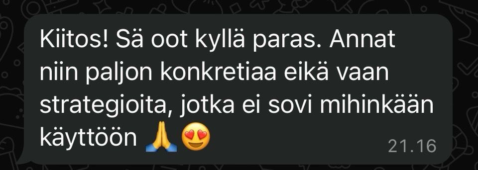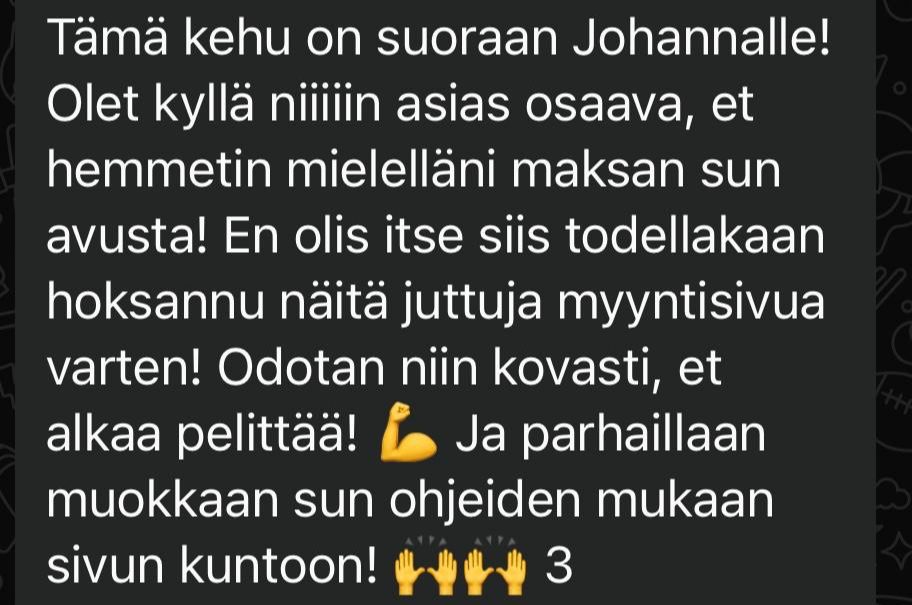 TÀÀ valmennus on tuonut todella isoja tuloksia aiempaan. En aio jatkaa yksin yrittÀmistÀ, vaan haluan pysyÀ sun kelkassa, nimittÀin mulla on vahva luotto siihen, ettÀ sinÀ autat mua nostamaan oman yrittÀjyyden aivan uudelle levelille ensi vuonna. Vuosi 2026 on mun lÀpimurtovuosi. Kiitos Johanna! Oot ihan timantti tÀllÀ alalla! <3