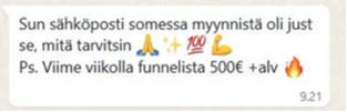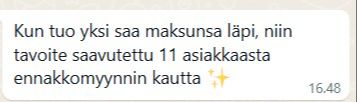 Annan valmennukselle tulostakuun. Jos et ole 5kk aikana saanut myyntiÀ vÀhintÀÀn valmennuksen hinnan verran, ohjaan sinua Telegramissa tai alumniryhmÀssÀ niin kauan kunnes Sinulla on vÀhintÀÀn valmennuksen hinnan verran myyntiÀ.